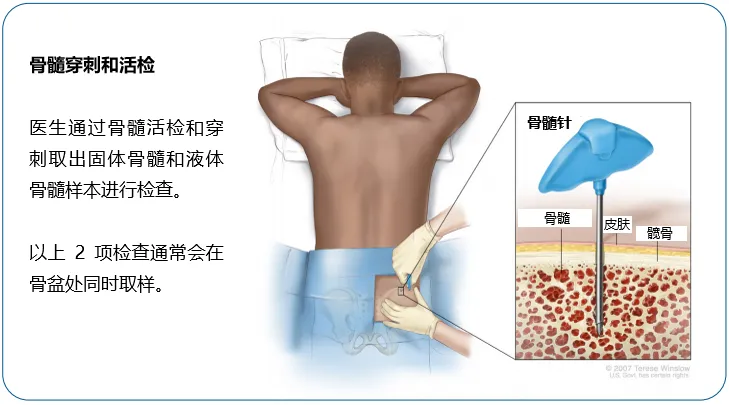 骨髓活检是取出骨髓和软骨髓样本。骨髓穿刺是取出液体骨髓。这两种活检通常在髋骨后侧同时取样,因为髋骨后侧含有大量的骨髓。