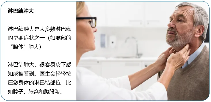 淋巴结肿大是PTCL早期症状之一。淋巴结肿大,很容易皮下感知或被看到。医生会轻轻按压您身体的淋巴结部位,比如脖子、腋窝和腹股沟,也会按压脾脏和肝脏来评估大小。口咽部(喉咙后部、嘴巴靠后位置)也会用来评估癌症症状。