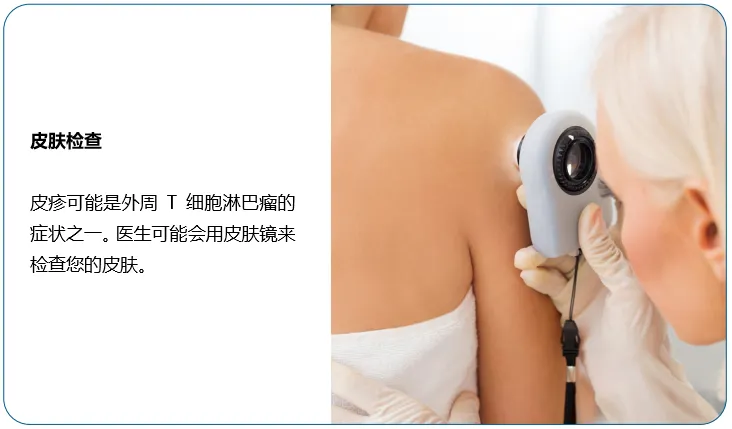 外周T细胞淋巴瘤和其他亚型的T细胞淋巴瘤都可能会累及皮肤。医生可能会根据您的皮肤情况,安排您做皮肤活检。皮肤活检是取下一到两层皮肤样本来检测癌症。