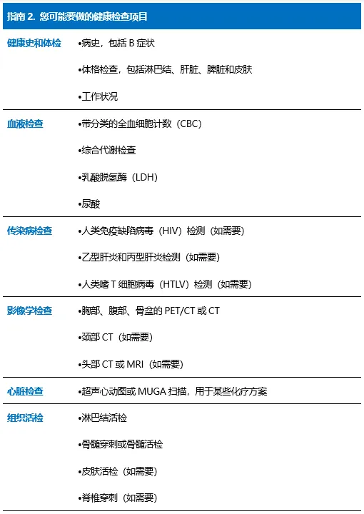 指南2中列出了病史、健康检查和其他用于诊断和治疗外周T细胞淋巴瘤的检查项目。