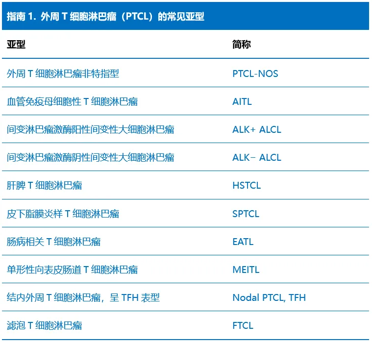 除了以上3种最常见的PTCL亚型外,还有许多其他亚型,参见指南1(下表)。