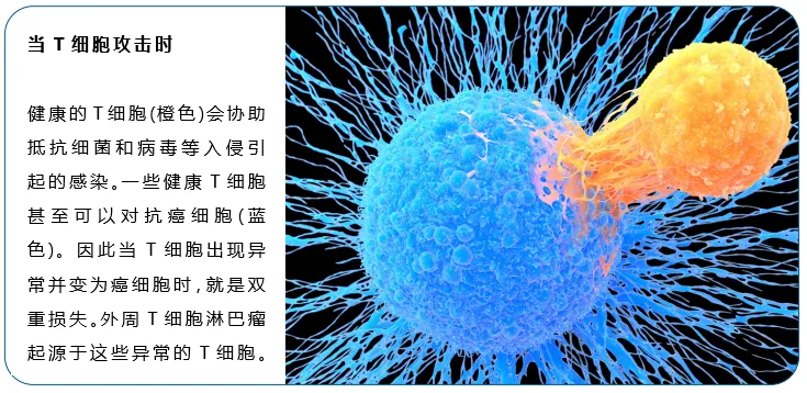 有时健康的成熟T细胞甚至可以对抗癌细胞。因此当T细胞出现异常并变成癌细胞时,就是双重损失。外周T细胞淋巴瘤就起源于这些异常的T细胞。