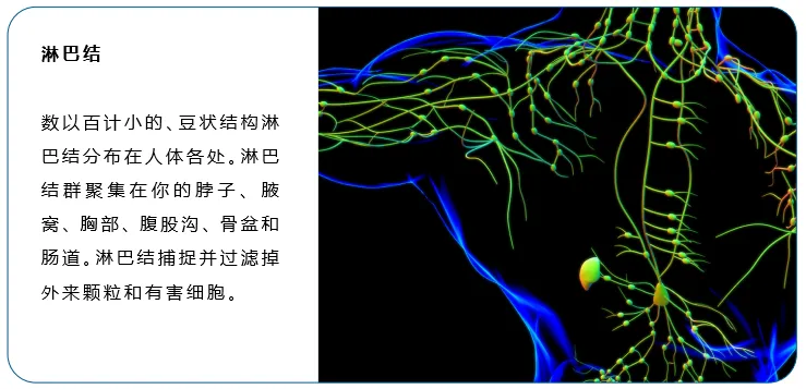 当淋巴液流经全身的淋巴管时,淋巴结会捕捉并过滤掉外来颗粒和有害细胞。淋巴结是小的豆状结构。数以百计的淋巴结遍布全身。淋巴结通常聚集在你的颈部、胸部、腋窝、腹股沟、骨盆和肠道。(颈部淋巴结称为“腺体”。)