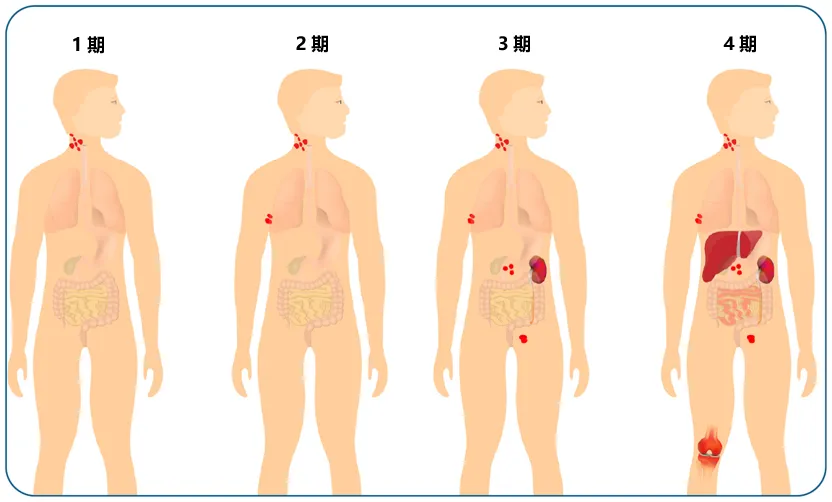 ·4期 -病灶从淋巴系统扩散到身体其他部位,如肝、肺、肾、胃肠道或骨髓等其他器官发现1、2、3期及以上病灶。