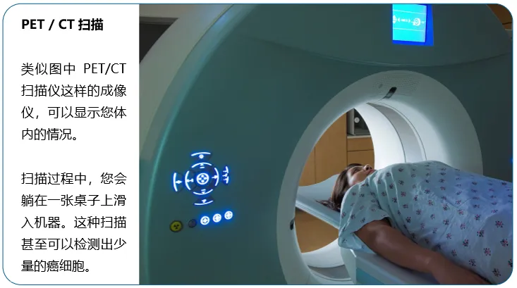 ·PET扫描显示体内细胞是否正常工作。它会突出显示可能癌变的细胞,甚至可以显示少量癌细胞。PET扫描前,要给您血液中注射放射性示踪剂。扫描过程中,特殊的照相设备可以检测到放射性示踪剂,让癌细胞成像更亮。扫描结束后,放射性示踪剂会随尿液排出体外。